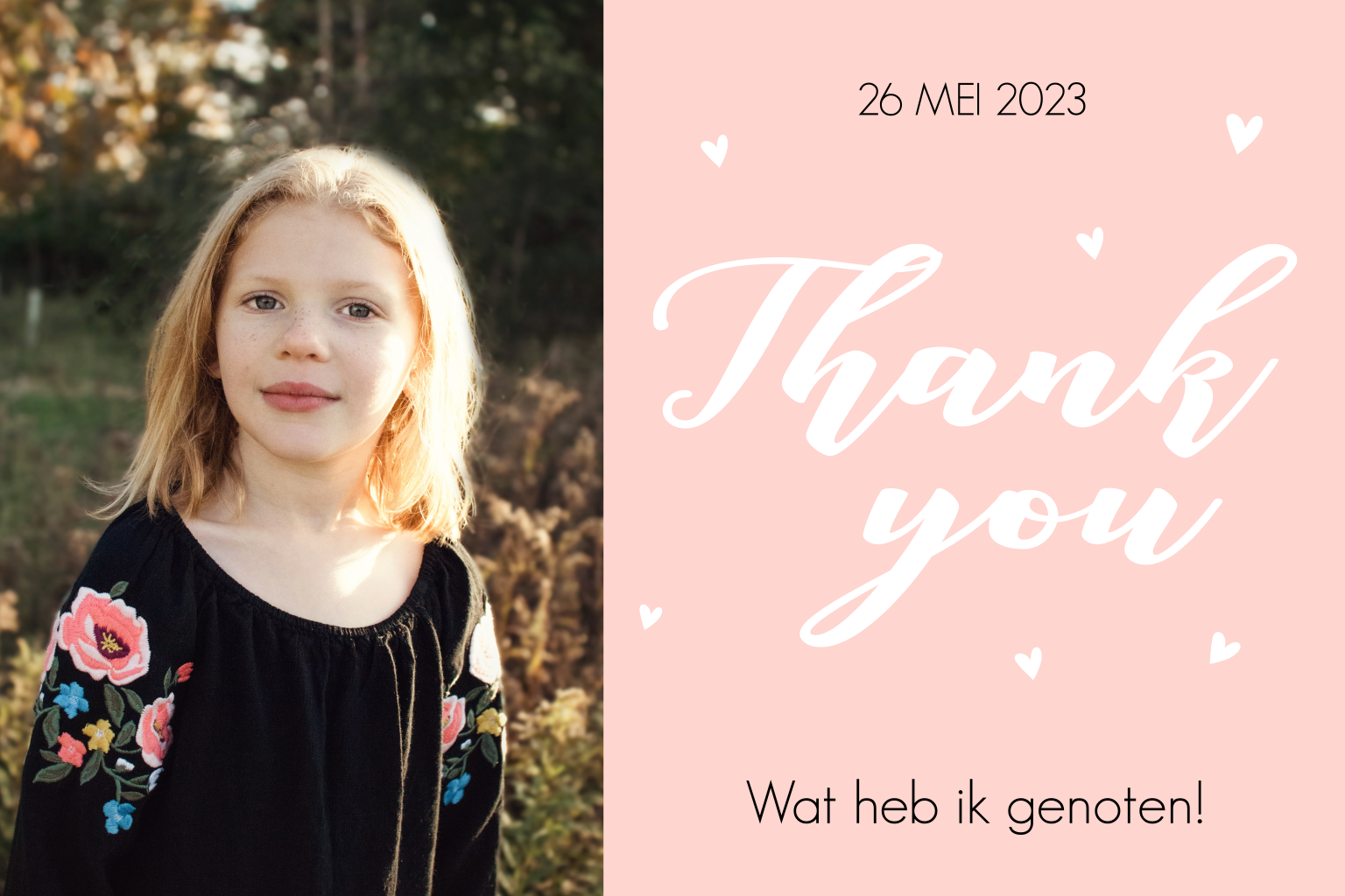 Romantische bedankkaart communie voor meisje met foto en roze hartjes
