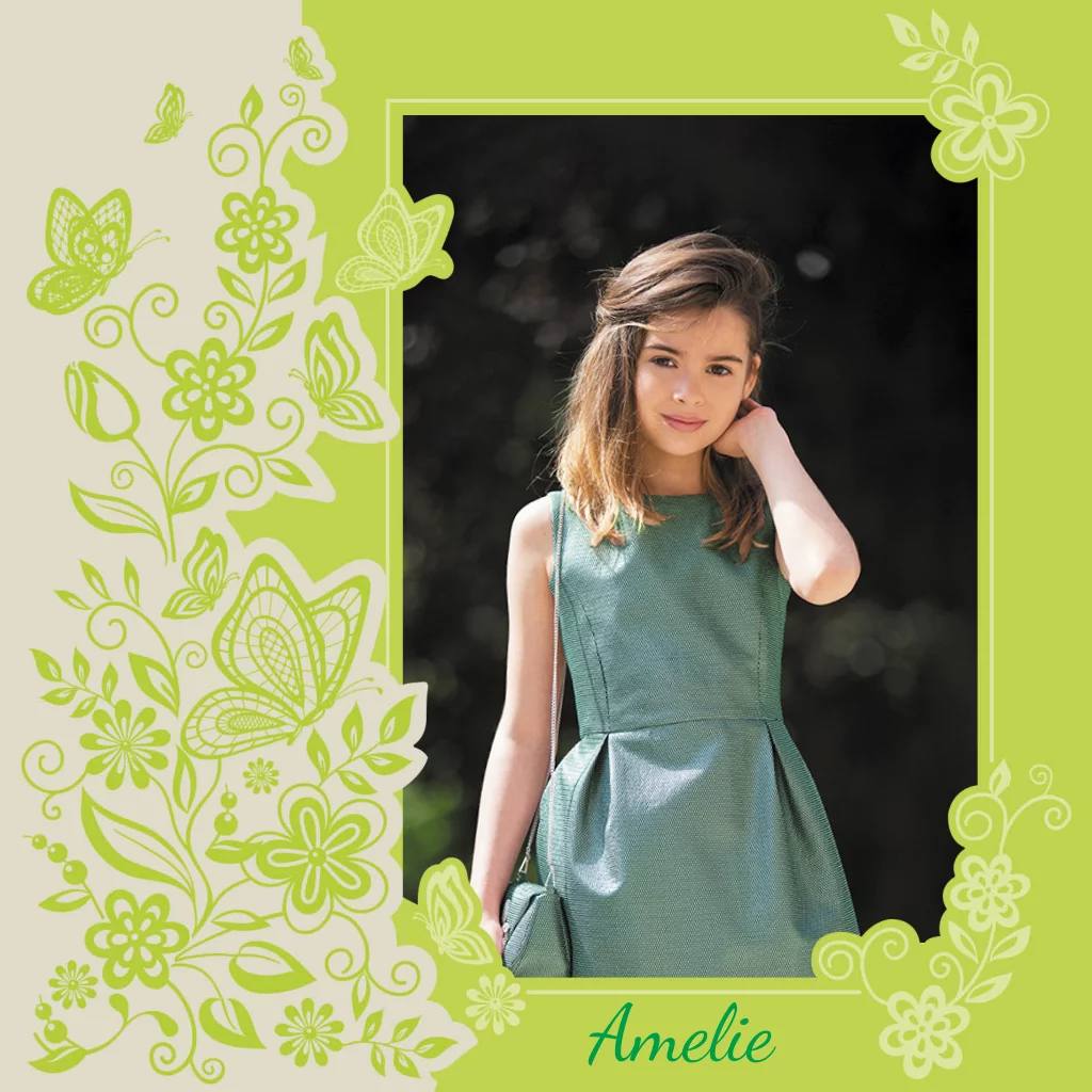 De bloemen en de vlindertjes geven aan deze kaart een romantische uitstraling! Met het plaatsen van je eigen foto wordt deze bedankkaart een mooie herinnering voor je gasten.