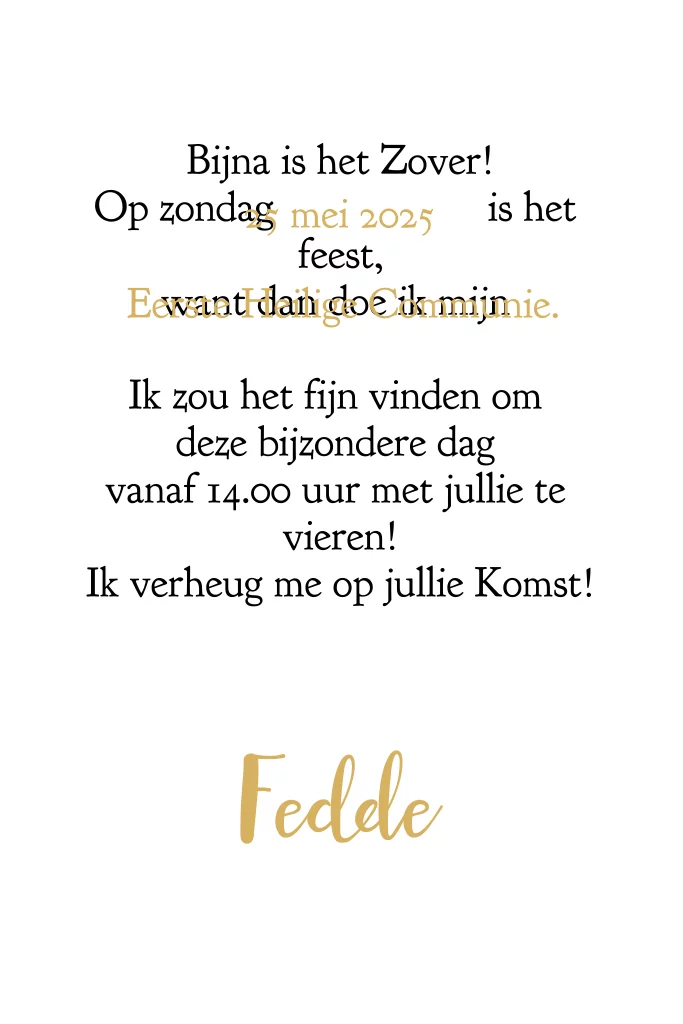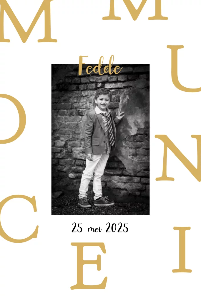 Hippe communiekaart voor een jongen met het woord communie in losse letters verspreid en een foto. De ballonnen geven een feestelijke uitstraling aan deze kaart. De kleuren kun je zelf aanpassen.