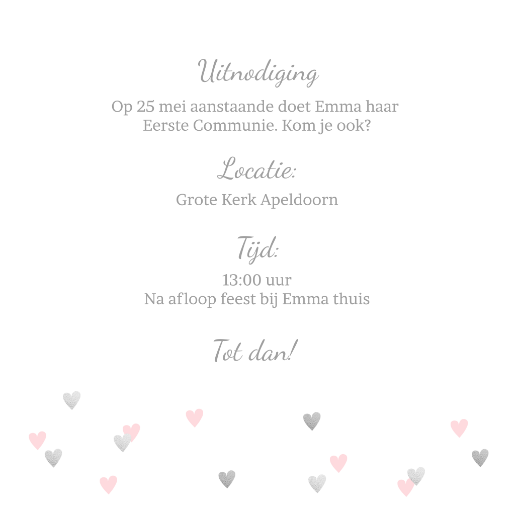 Een lieve communiekaart voor een meisje, met hartjes in roze en zilverkleur. Vervang zelf de foto en pas de teksten aan in de editor.