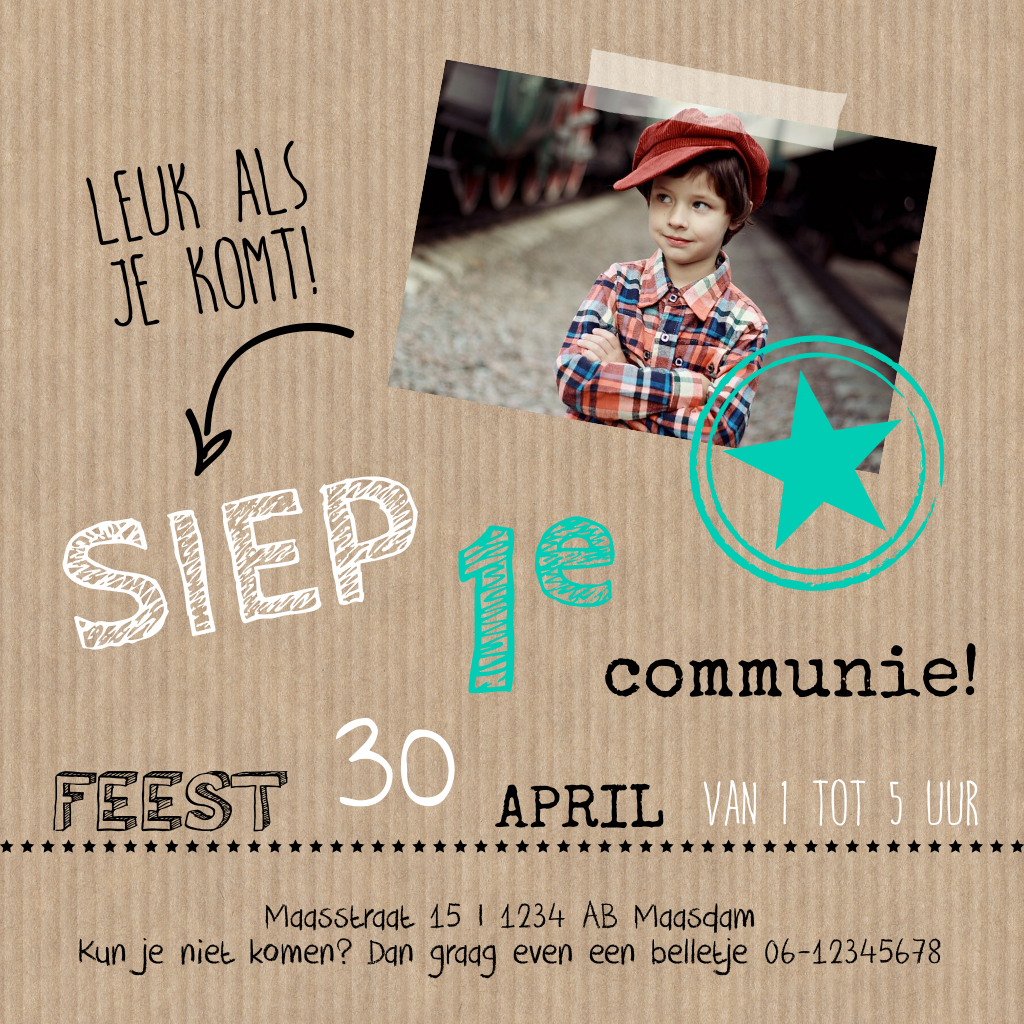 Wat een stoere communiekaart! De verschillende lettertypes op de kraft achtergrond maken deze kaart uniek.