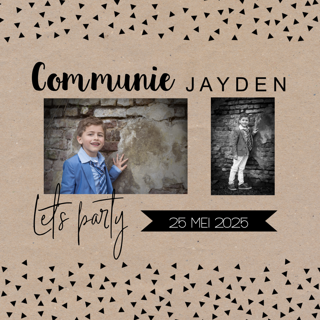 Trendy uitnodiging voor de communie van een jongen met kraftpapier achtergrond en zwart driehoekjes patroon. Op deze kaart is er ruimte voor twee foto's. De tekst kan in de editor aangepast worden.
