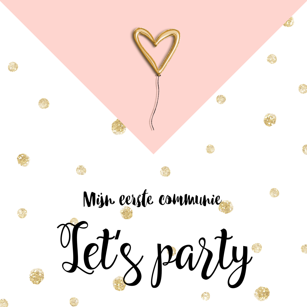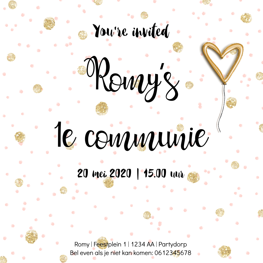 Hip communiekaartje voor een meisje met een achtergrond in roze en goudkleurige stippen. Door de ballon in de vorm van een hartje krijg je een originele uitnodiging. Pas de tekst in de editor aan.