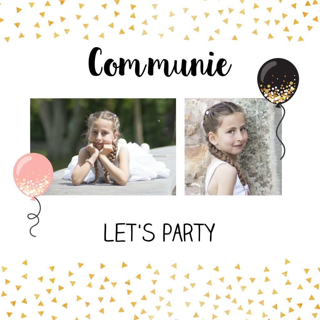 Trendy uitnodigingskaart voor de communie van een meisje met ballonnen en goudkleurige driehoekjes. Voeg je eigen foto's in de editor toe.