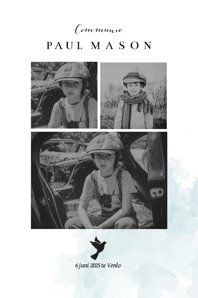 Hippe communiekaart met blauwe waterverf en duifje