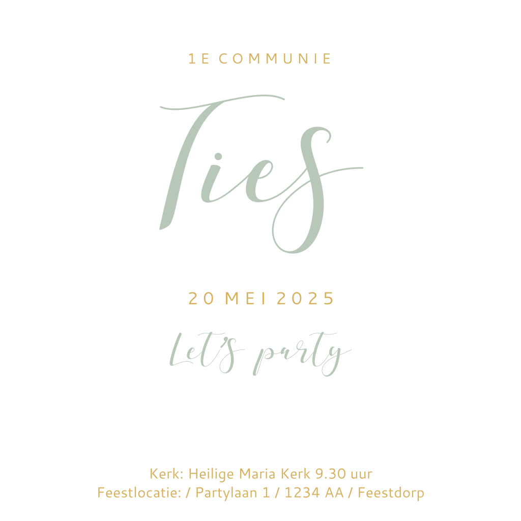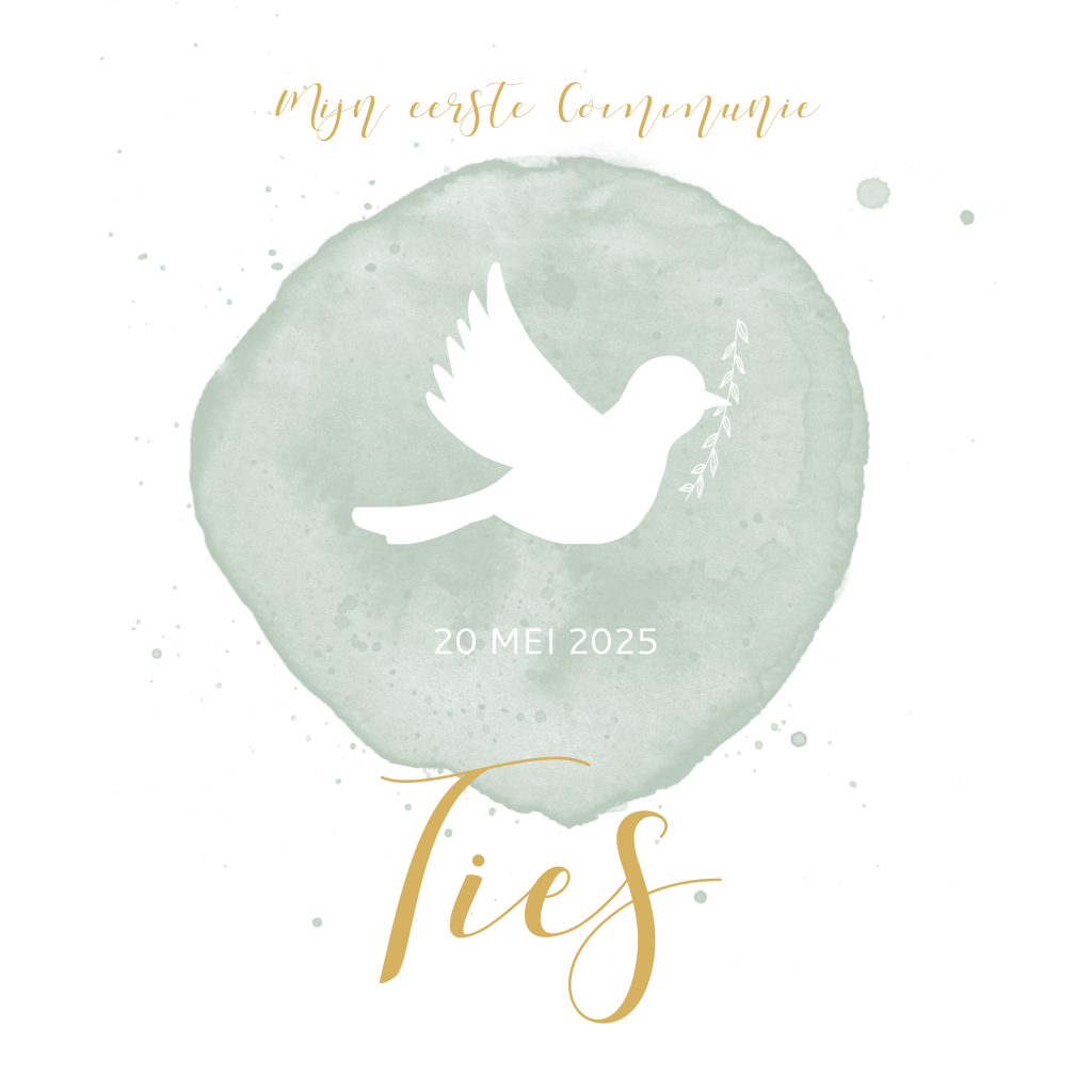Uitnodigingskaartje voor de communie van een jongen. De groene watercolor en de duif geven aan deze kaart een zachte en rustige uitstraling. De tekst kun je zelf in de editor aanpassen.