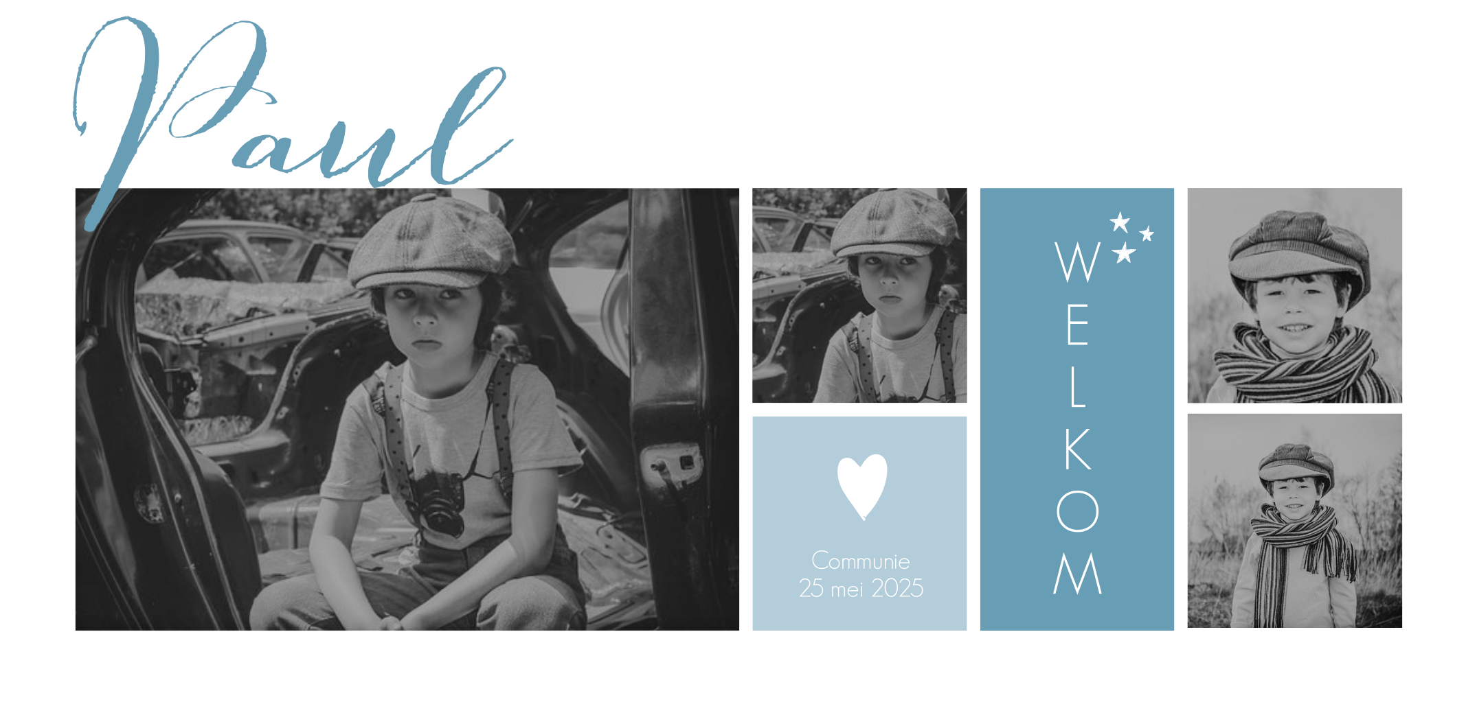 Hippe communiekaart met blauwe vlakken, witte symbooltjes en ruimte om eigen foto's toe te voegen. Maak zo een persoonlijke kaart. De teksten pas je zelf eenvoudig aan in de online editor.