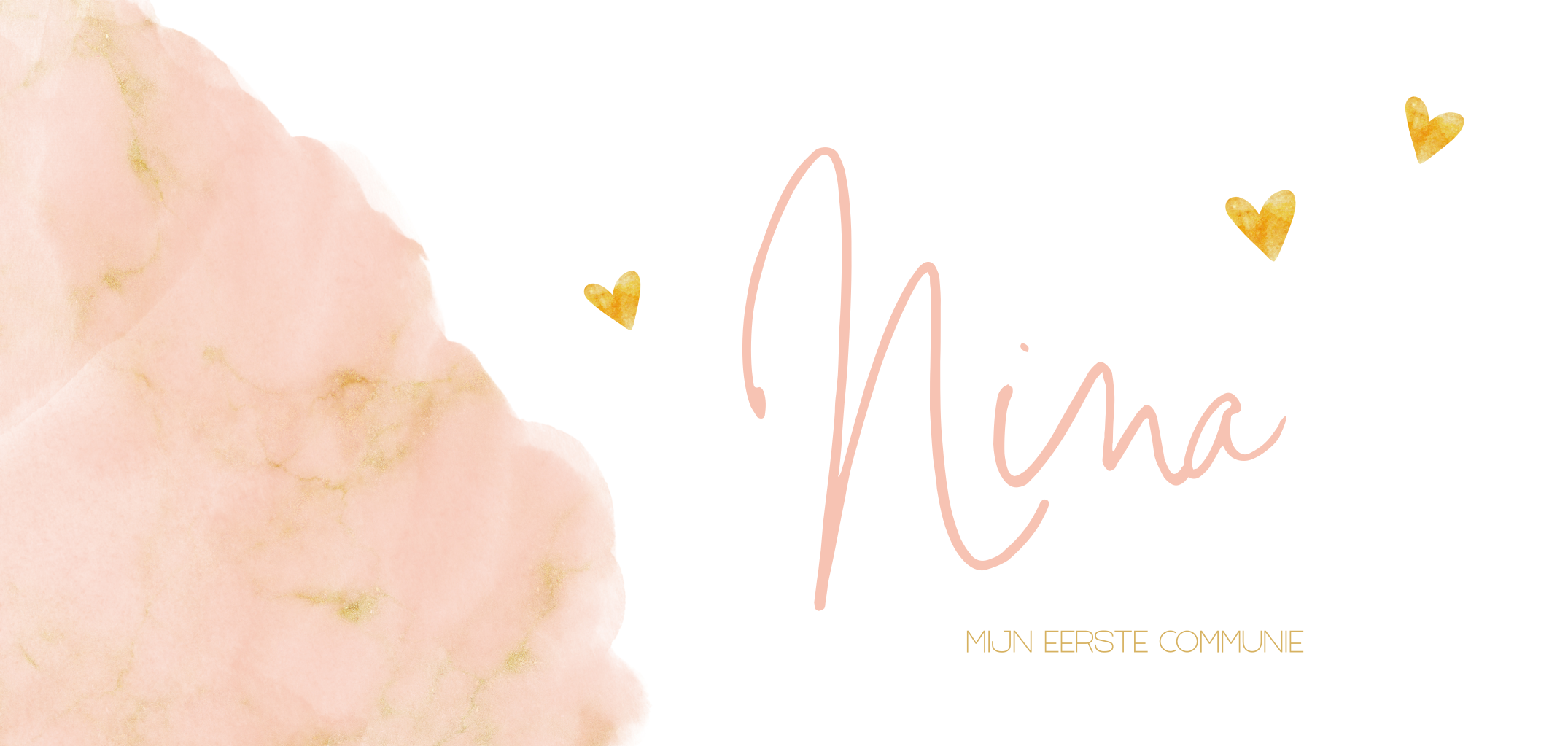 Stijlvol communiekaartje met roze waterverf en goudkleurige hartjes