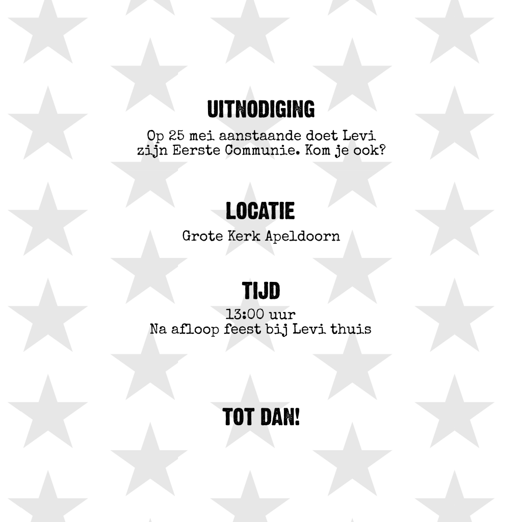 Een stoere communiekaart met sterren, foto en stempel, in zwart, wit en grijs voor een jongen. Vervang zelf de foto en pas de teksten aan.