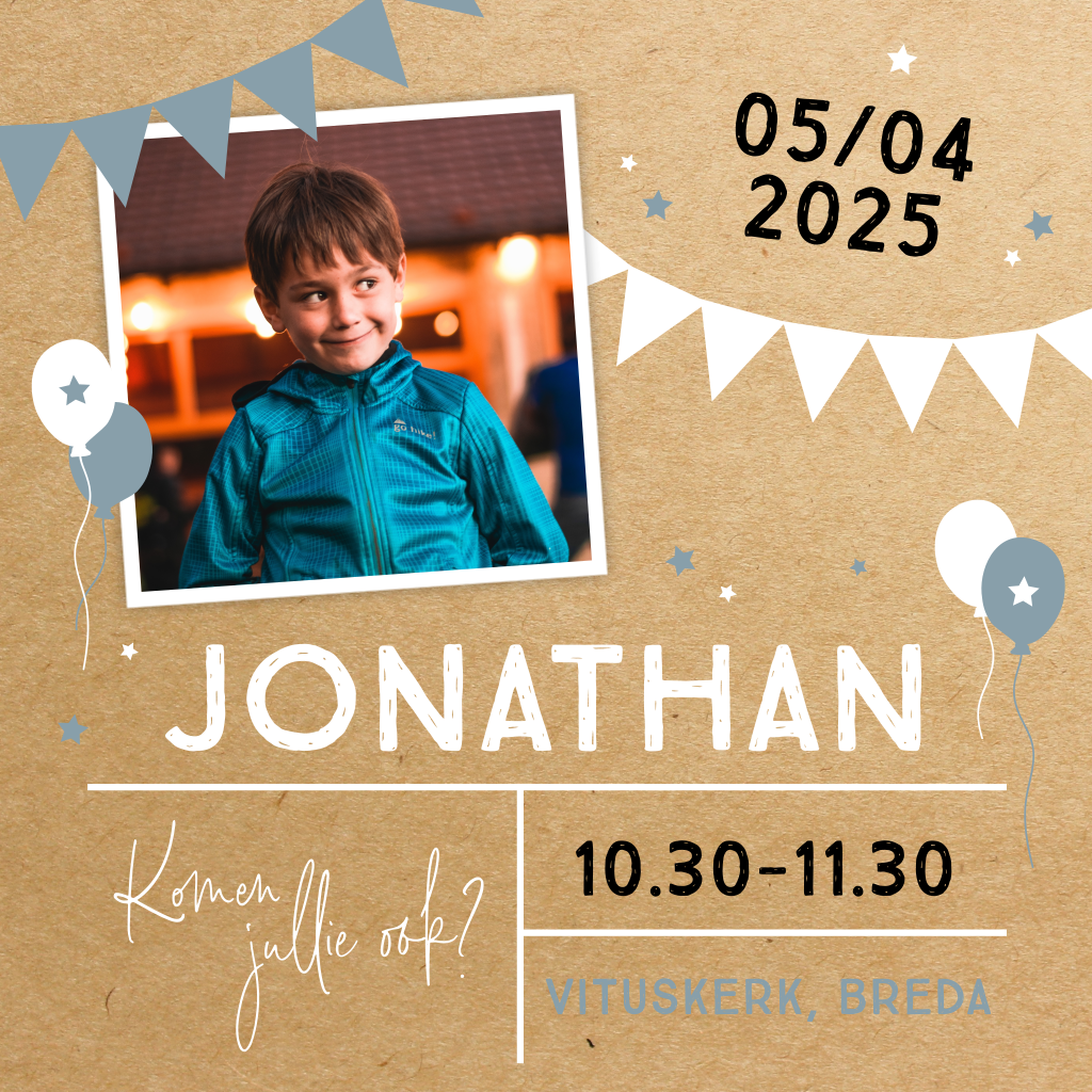 Stoere communiekaart met slingers, ballonnen en foto op kraftlook