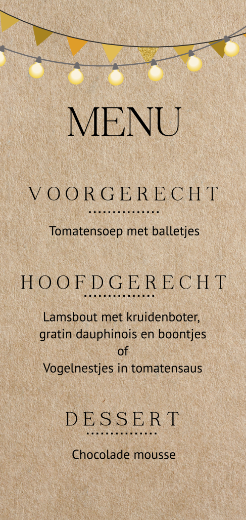 Hippe menukaart voor een communie met vlaggenlijn en lampjes slinger op een kraftlook achtergrond. Pas de teksten op de kaart eenvoudig aan in de online editor.