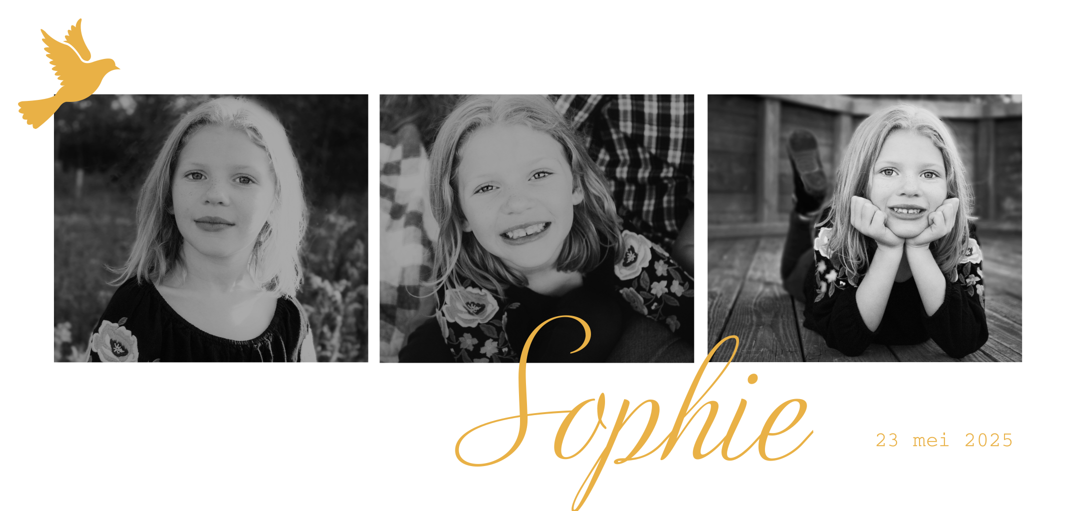 Hippe communiekaart met 3 eigen foto's en een duifje in okergeel. Pas deze kaart helemaal aan naar je eigen smaak in de online editor. Wijzig de teksten en bijvoorbeeld lettertype en kleuren.