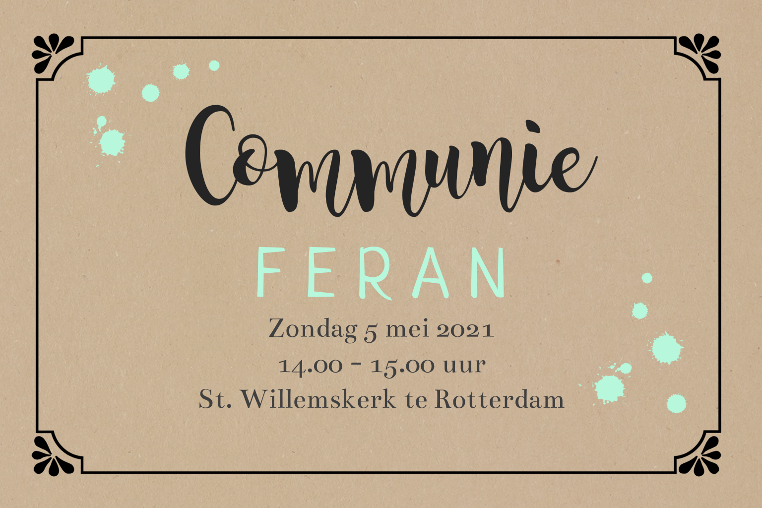Mooie communiekaart om jullie gasten uit te nodigen! De kraft achtergrond en de stippen in mint geven een stoere uitstraling aan deze uitnodiging.