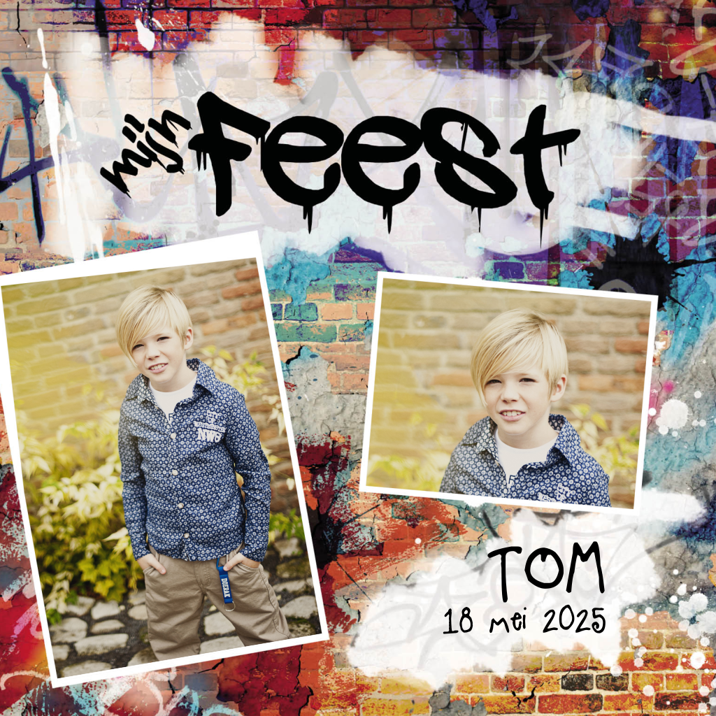 Deze kaart is de perfecte kaart voor een stoere jongen! De twee foto's vinden op een leuke achtergrond van graffiti plaats.