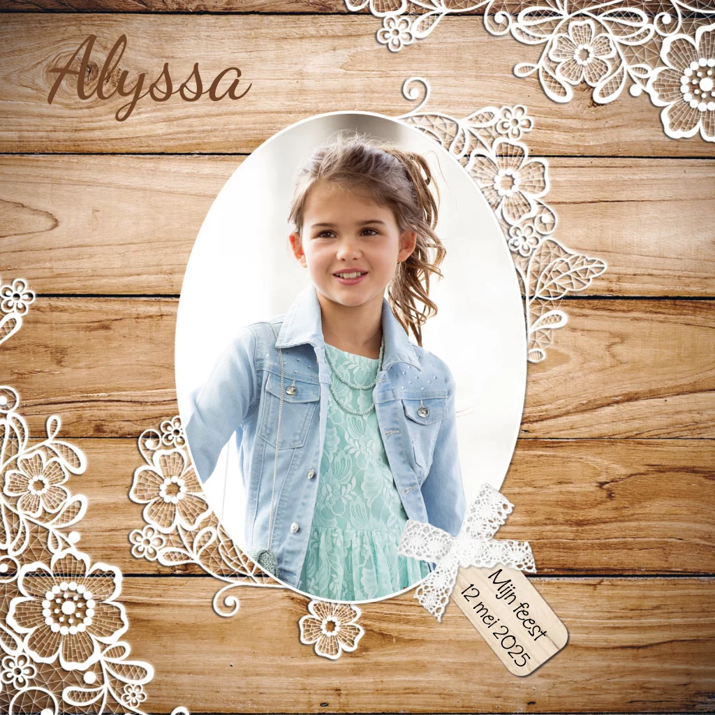 Deze uitnodigingskaart is origineel door de houtenachtergrond en het kant. Voeg je persoonlijke foto toe om de kaart helemaal eigen te maken.
