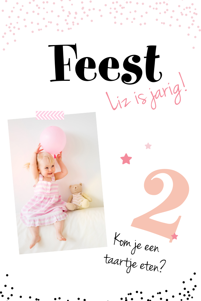 Lieve uitnodiging voor een kinderfeestje. Vrolijk door de confetti aan de boven en onderkant van de kaart. De persoonlijke foto van jouw tweejarige kindje maakt de kaart helemaal af. Leuk met een lichtroze of peach kleur envelop.
