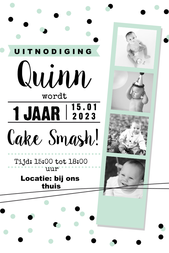 Een stoere, hippe uitnodiging voor een kinderfeestje met fotostrip, tekst en confetti. Pas zelf de teksten aan en vervang de foto's.