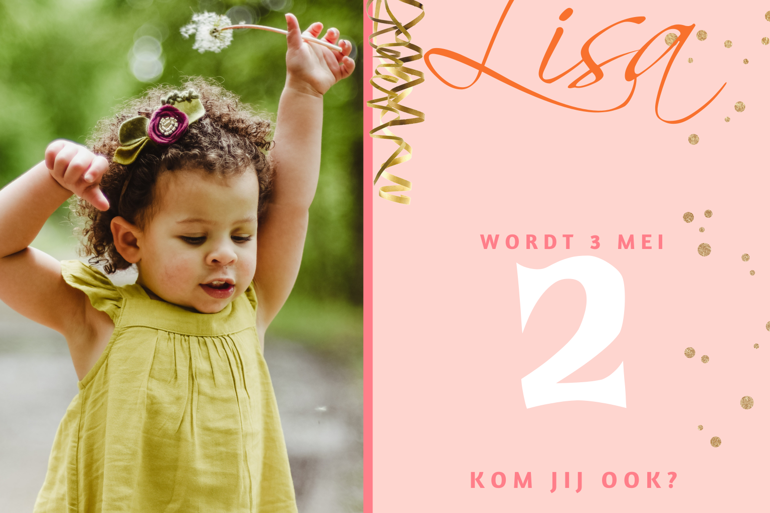 Feestelijke uitnodiging voor de verjaardag van een meisje met goudkleurige slingers en confetti. Plaats je eigen foto op het kaartje.