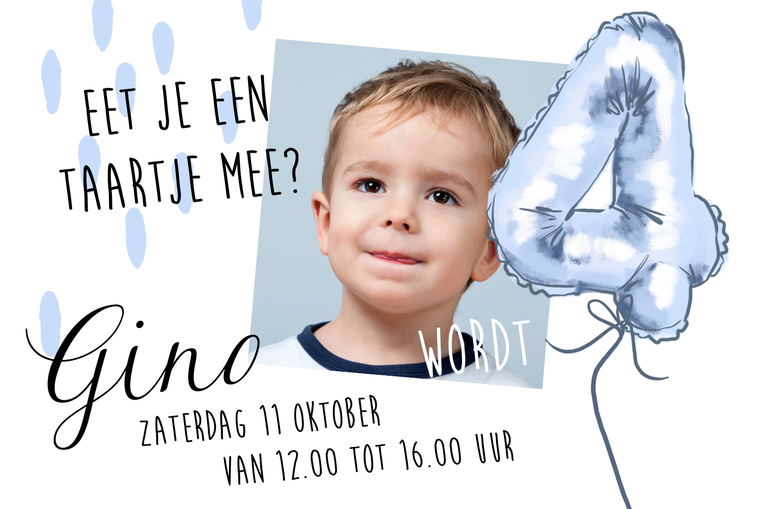 Getekende uitnodiging voor een jongen met een foto en een ballon. Plaats je eigen foto in het kaartje.