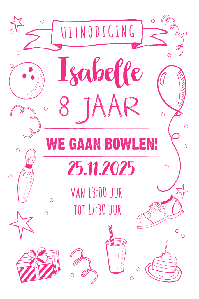 Een leuke uitnodiging voor een bowling kinderfeestje. Pas zelf de teksten aan. De roze kleur is ook aanpasbaar.