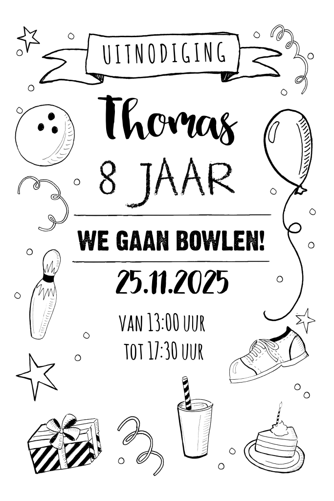 Een leuke uitnodiging voor een bowling kinderfeestje. Pas zelf de teksten aan. De kleur is ook aanpasbaar.