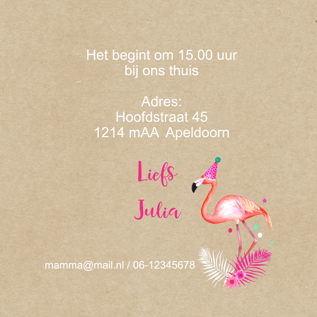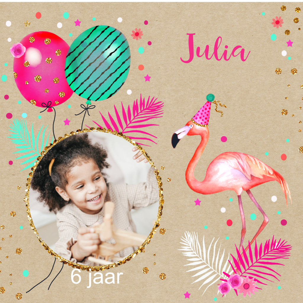 Hippe uitnodiging voor het verjaardgasfeestje van je dochter met watercolor illustraties zoals een flamingo, bladertakken en ballonnen op een kraft achtergrond. Voeg een leuke foto toe en maak een persoonlijk kaartje!