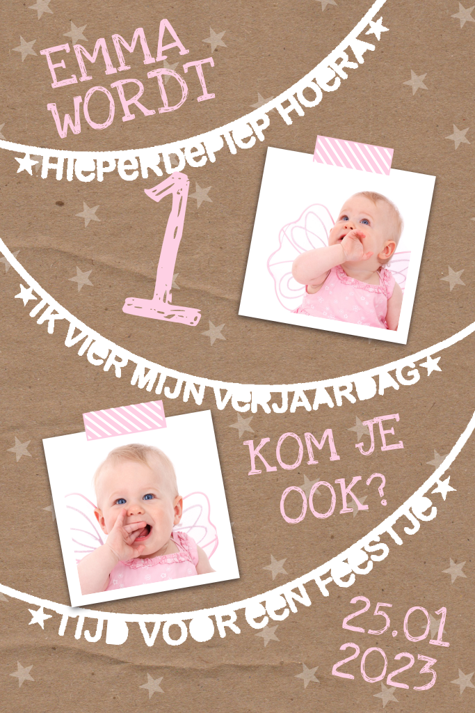 Gave uitnodiging voor de eerste verjaardag van een meisje. Met kraft, sterren, slingers en foto's ziet deze uitnodiging er uit als een feestje!