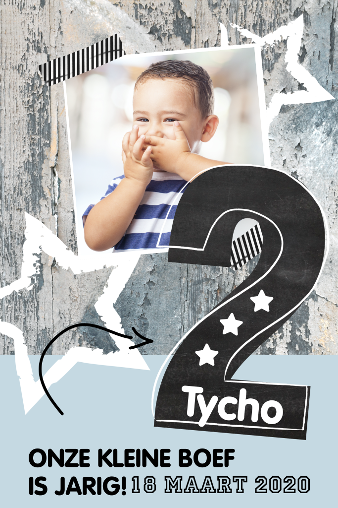Een leuke en stoere uitnodiging voor de tweede verjaardag van jouw zoontje. Plaats de foto van jouw kindje op het kaartje op de houten achtergrond, versierd met sterren.