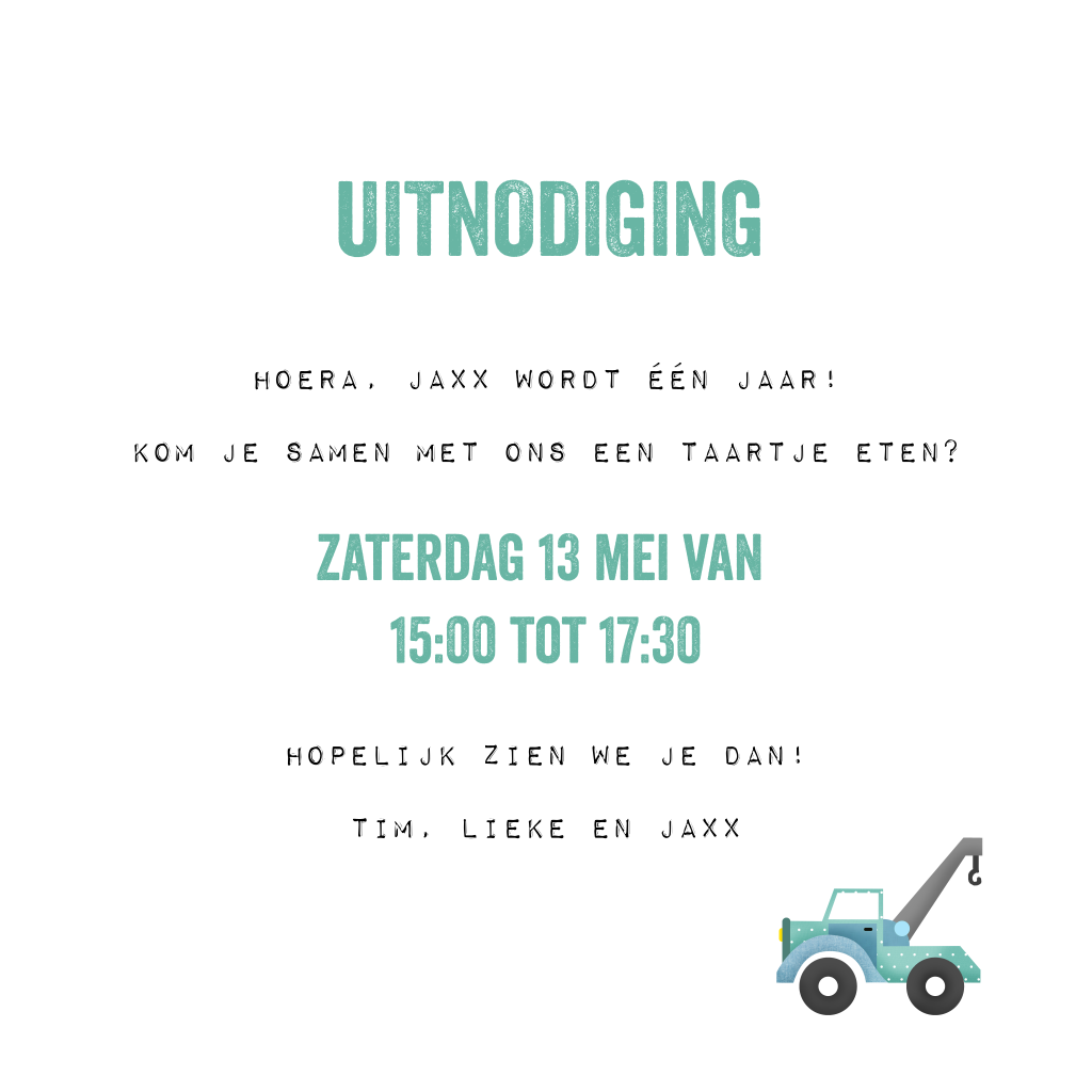 Stoere uitnodiging voor de 1e verjaardag van een jongen met een leuke kraanwagen op de voorkant. Als jouw dreumes van auto'tjes hout, dan is dit een leuke kinderfeestje-uitnodiging.