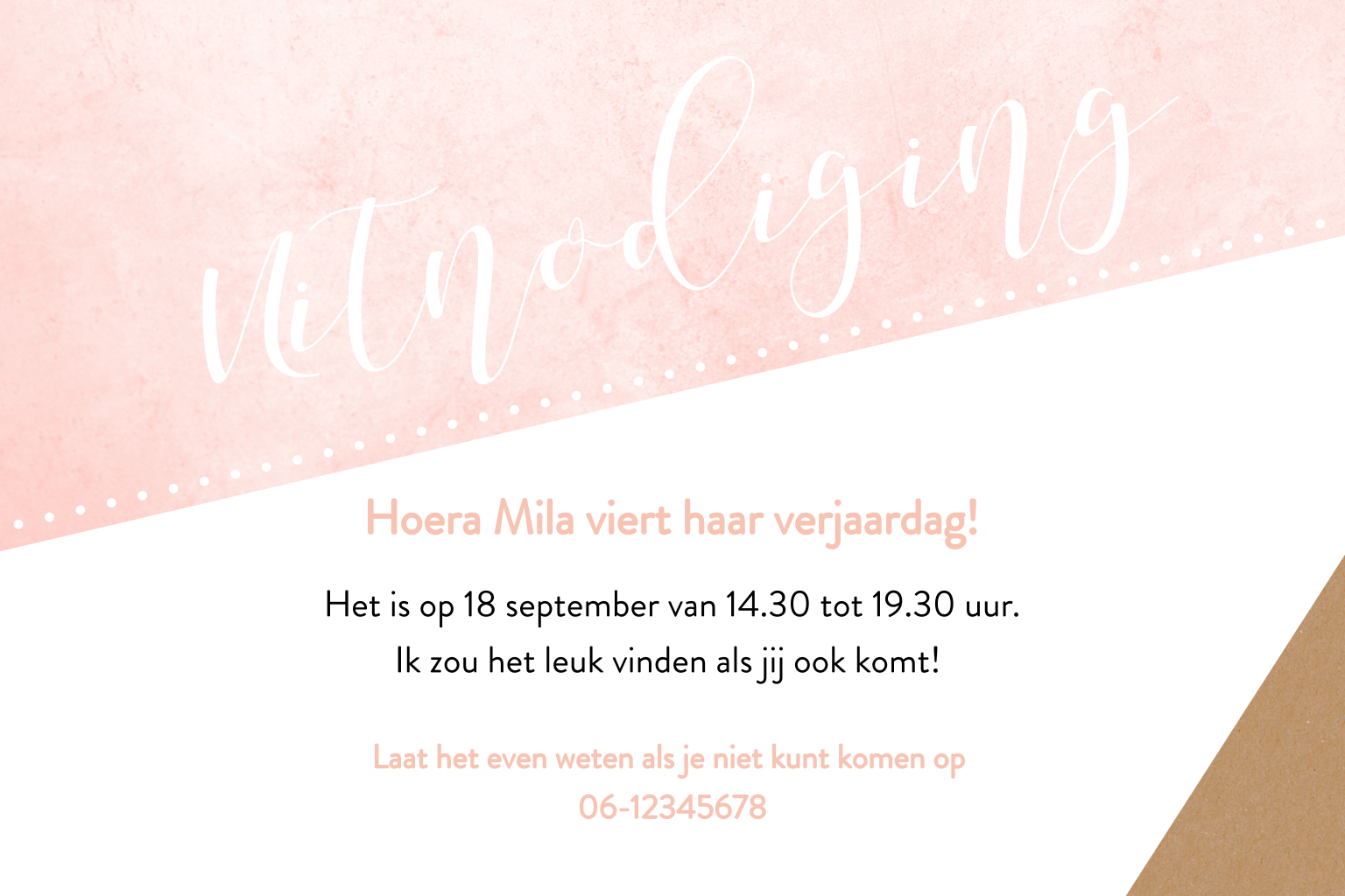 Trendy uitnodiging kinderfeestje met schuine roze en kraft vakjes
