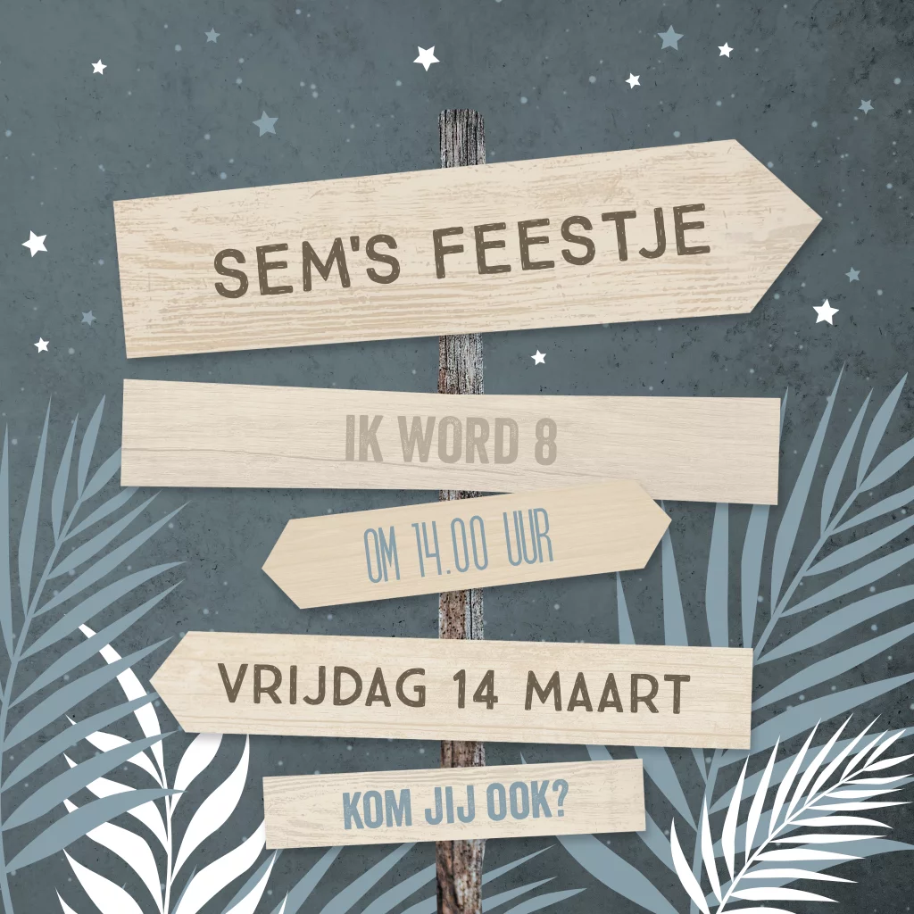Trendy uitnodigingskaart voor een jongen met strandpaal en takjes