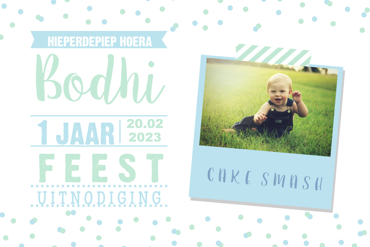 Met een leuke blauwe polaroid op een kaartje met confetti, nodig jij je ouders, broers en zussen en buren uit voor de eerste verjaardag van je zoontje. Echt vrolijke uitnodiging voor als je jongen 1 jaar wordt.