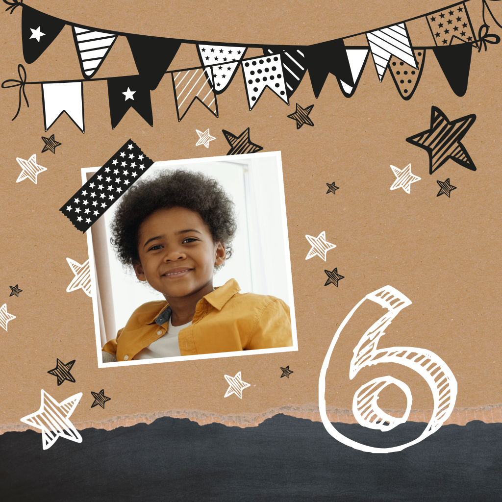 Hoere, 6 jaar! De slingers zijn al opgehangen! Dit hippe verjaardagskaartje op een kraftachtergrond is versierd met vlaggetjes en sterren met verschillende patroontjes. Ook tof is de plaktape bij de foto. Een stoer verjaardagskaartje voor een jongen!