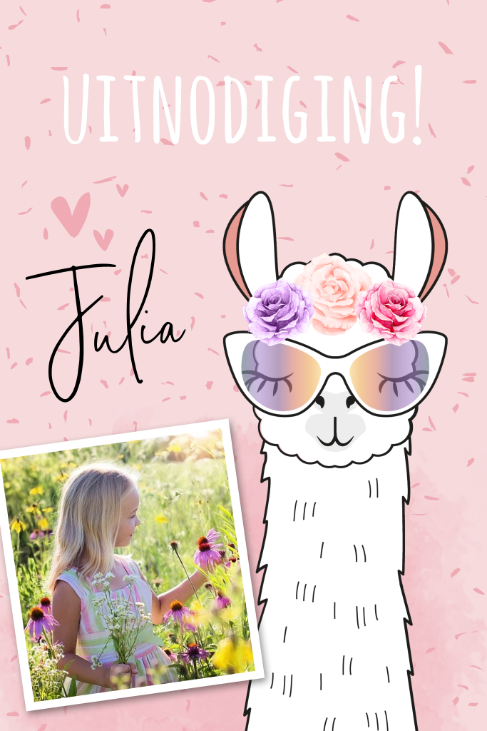 Vrolijke verjaardagsuitnodiging voor de verjaardag van jullie dochter. Op het roze kaartje staat de illustratie van een hippe alpaca met zonnebril en bloemenkrans. In het polaroid kader kun je een eigen foto toevoegen en ook op de achterzijde is ruimte voor een eigen foto. Pas de teksten op dit kaartje naar wens aan in de online editor.
