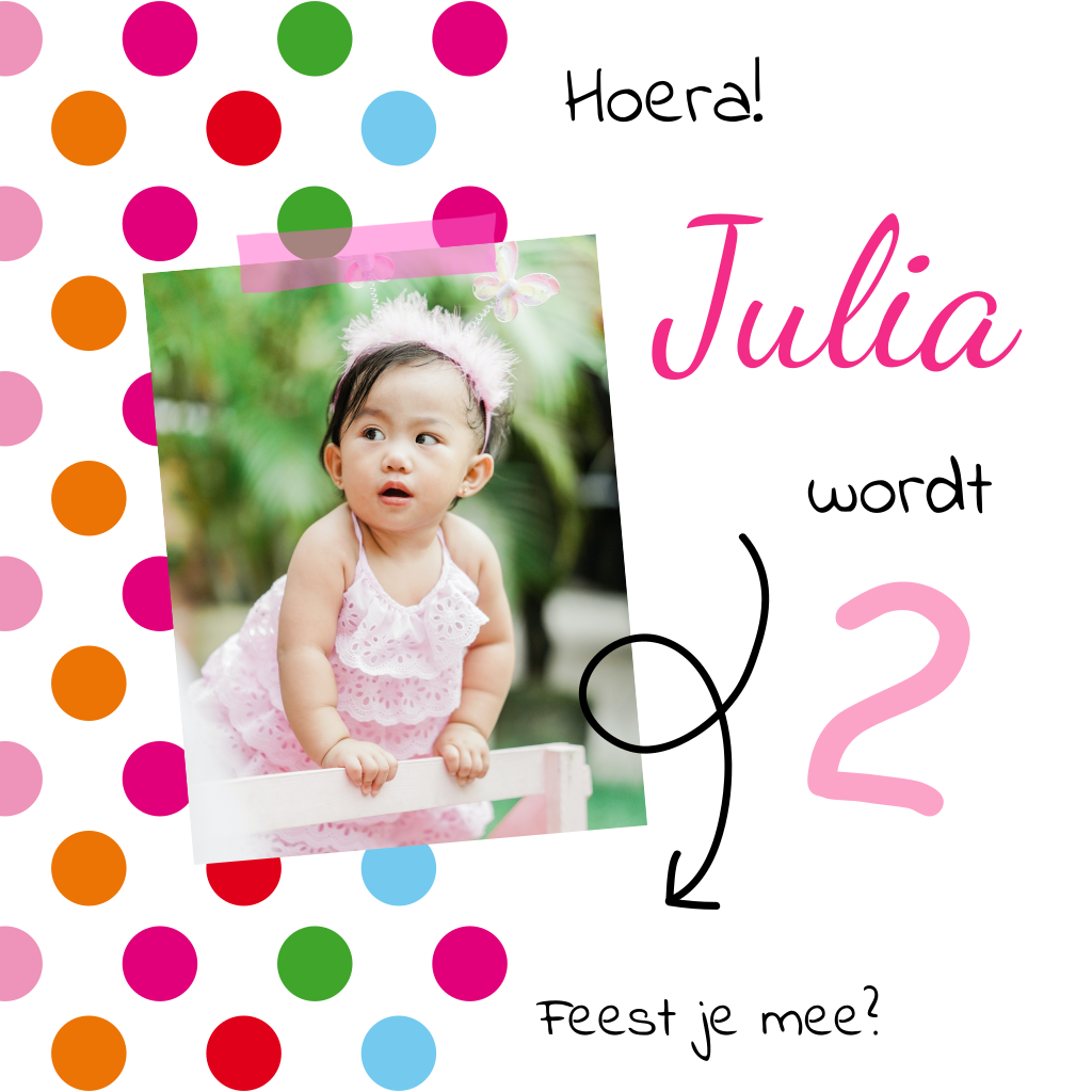 Al die gekleurde stippen, wat vrolijk! Ook leuk is dat je op de voorkant een foto kunt toevoegen. Wie nodig jij uit voor je verjaardag? Met dit vrolijke kaartje breng je iedereen alvast in de feeststemming! Kleuren en lettertypes zijn naar wens aan te passen in de online editor.