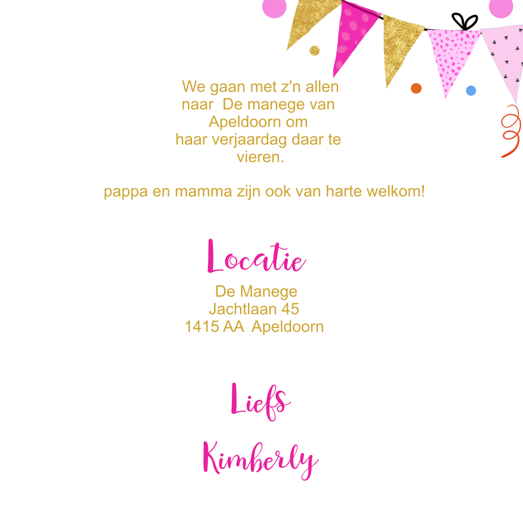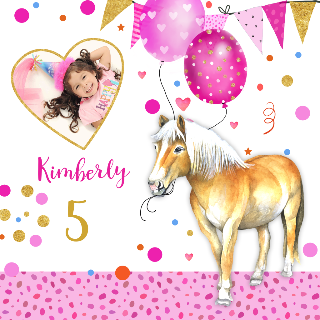 Uitnodiging voor een kinderfeestje met lief paardje versierd met ballonnen. Door de slingers en confetti heeft deze kaart een vrolijke uitstraling. Plaatst de foto van je dochter in het hartje.