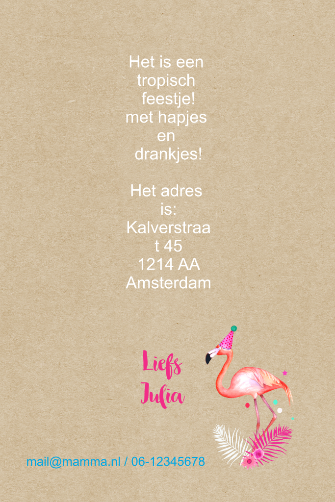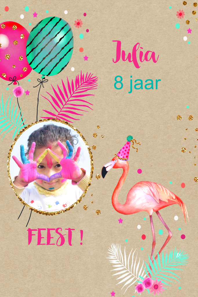 Botanisch kinderfeestje uitnodiging 8 jaar meisje met foto en flamingo
