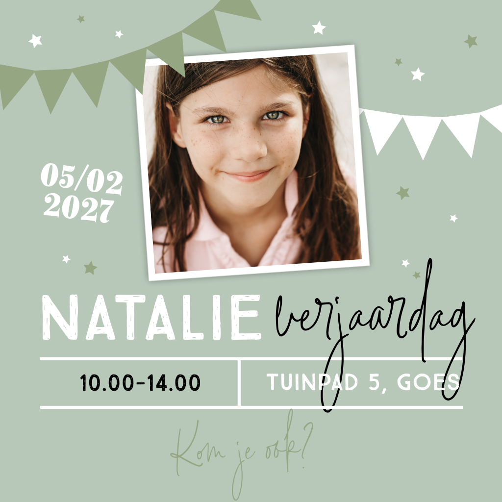 Kinderuitnodiging met slingers en foto op groene achtergrond