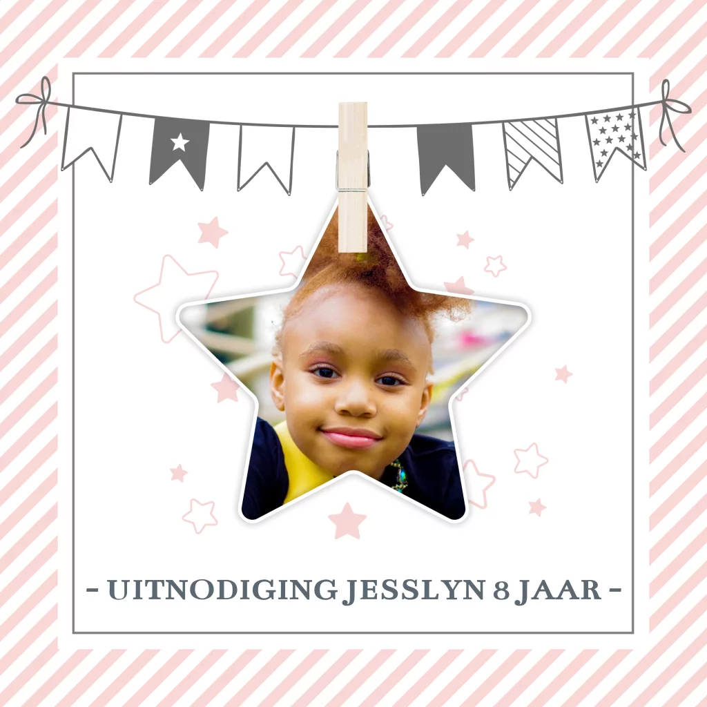 Een fotoster die met een wasknijper vastzit aan een slinger, wat origineel! Dit vrolijke uitnodigingskaartje heeft een roze streepjesachtergrond en is gepimpt met een slinger met diverse patroontjes en roze sterretjes. Leuk voor een meisje!