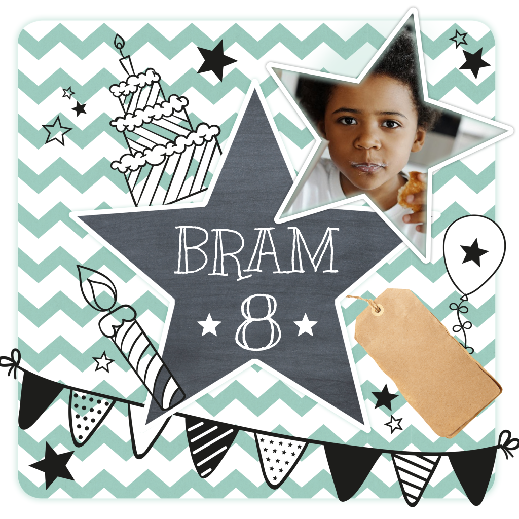 Wat een vrolijke en stoere uitnodiging voor een kinderfeestje! De grote ster in het midden met het hippe kraflabel valt echt op. De achtergrond combineert hier leuk bij en de zwart-wit tekeningen van een slinger, taart, kaarsje, ballon en sterren maken dit kaartje helemaal compleet. Voeg een leuke foto toe in de ster en maak dit verjaardagskaartje helemaal af!