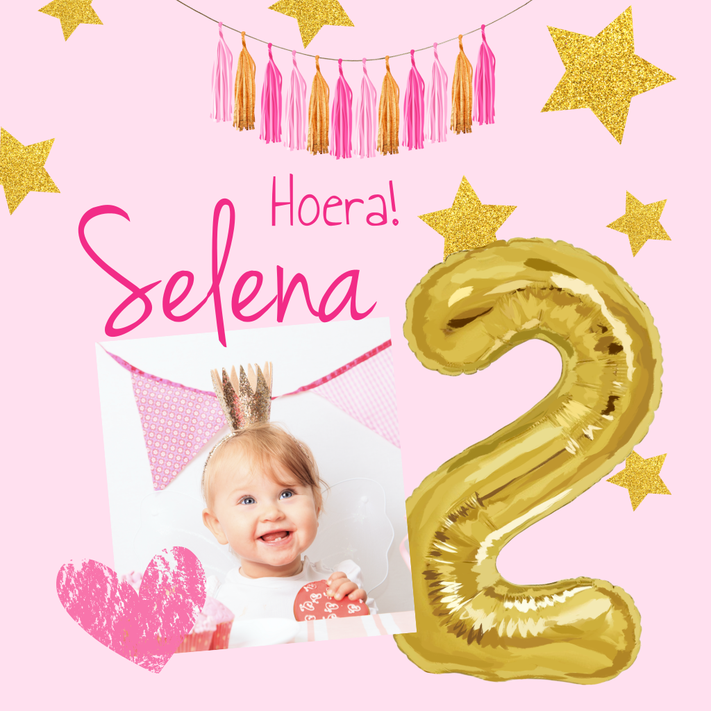 Vrolijke uitnodiging voor de tweede verjaardag van je dochtertje, versierd met een slinger, goudkleurige sterren en een goudkleurig cijfer. In de afbeelding vind je meer cijfers!