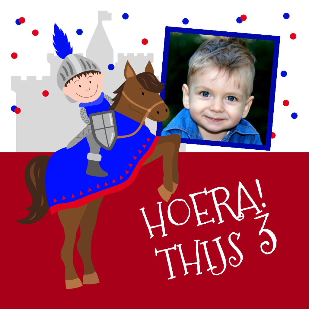 Een vrolijke, stoere uitnodiging voor een kinderfeestje van een stoere jarige job die 3 jaar wordt, met een ridder, kasteel, foto en rood blauwe confetti. Vervang zelf de foto en pas de tekst en lettertypes aan.