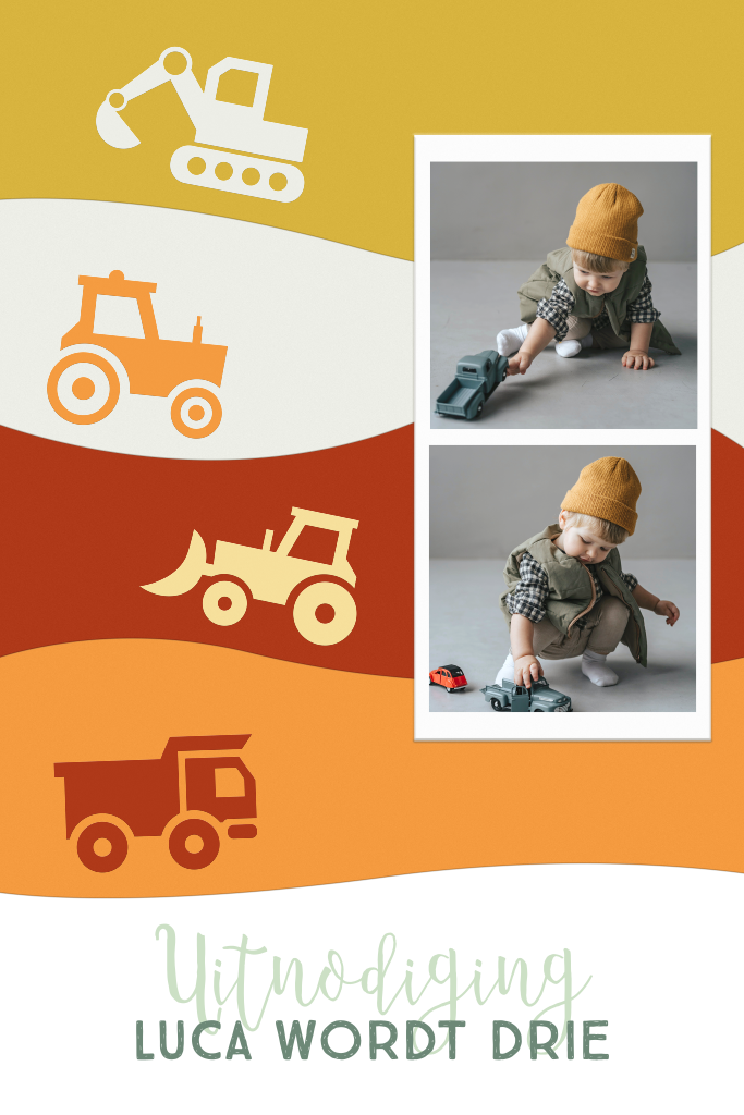 Vrolijke verjaardaguitnodiging in oranje, rood, geel en wit. In de fotostrip kun je twee leuke foto's van jullie zoontje downloaden in de online editor. Op de gekleurde vlakken staan afbeeldingen van trekkers, een graafmachine en een vrachtauto.