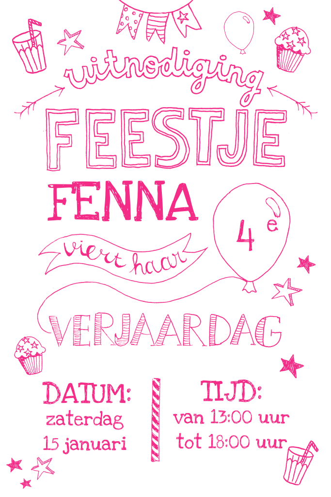 Hippe uitnodiging voor een verjaardagsfeestje van een meisje. Pas de kaart aan naar jouw wensen en zet de ballon, de beker ranja, de sterretjes en de cupcakes op de plek die jij wilt!