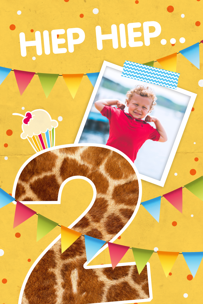 Wat een vrolijke verjaardagskaart met gekleurde vlaggetjes, stippen en een cakeje op een warme, gele achtergrond! Ook leuk is de grote, opvallende 2 van een giraffenpatroon. Voeg een leuke foto toe en maak er jouw kaartje van. Hiep hiep... hoera!