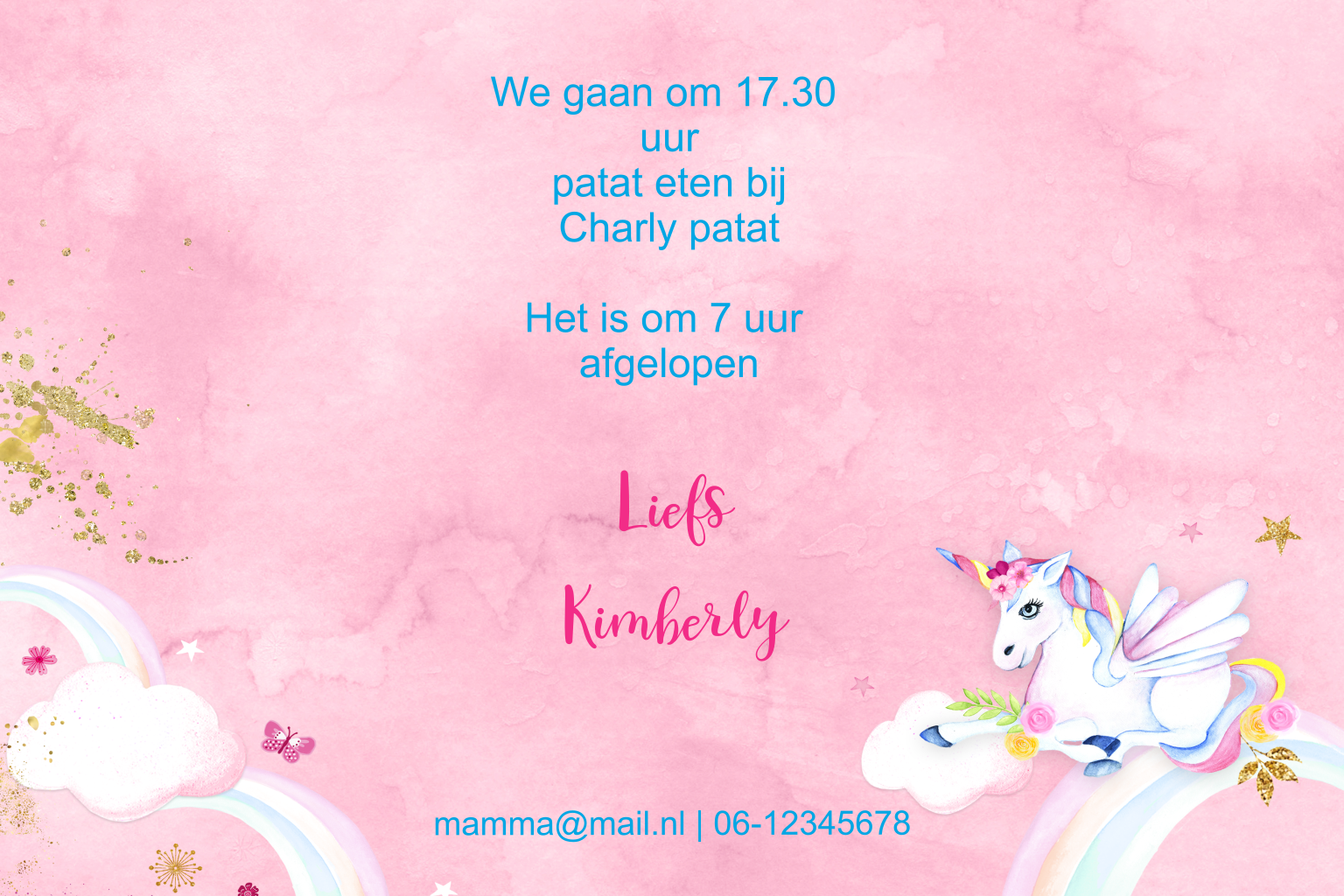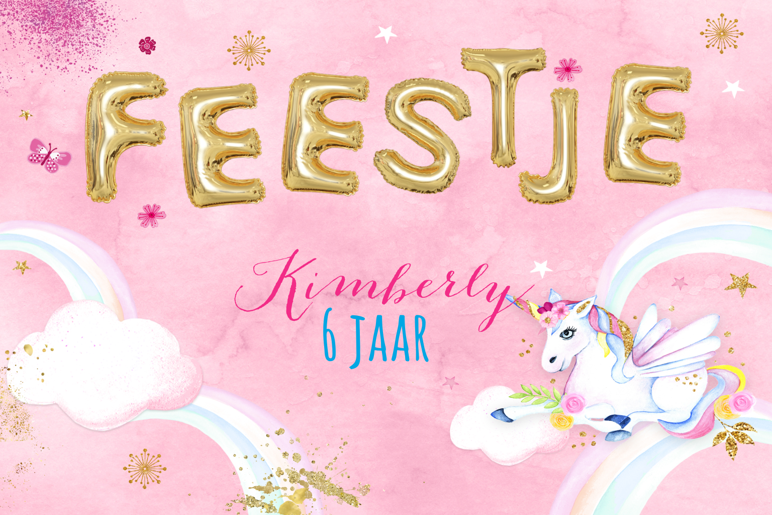 Is jou dochter ook zo dol op unicorns? Stuur deze feestelijke verjaardagskaart als uitnodiging voor je dochter's 6e verjaardag. Met op een roze achtergrond lieve regenboogjes en een hippe eenhoorn. Op de goudlook ballonnen letters op de voorkant wordt het echt een feestje!