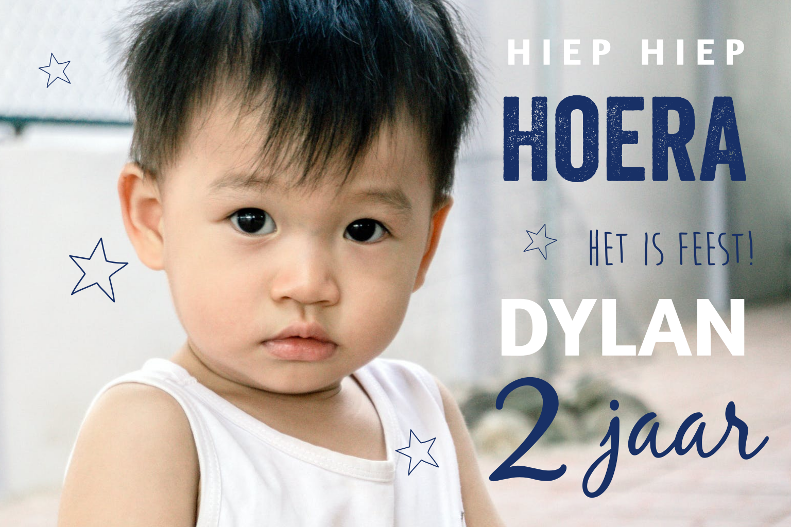 Hippe fotokaart als uitnodiging voor het verjaardagsfeestje van je zoon die 2 jaar wordt.