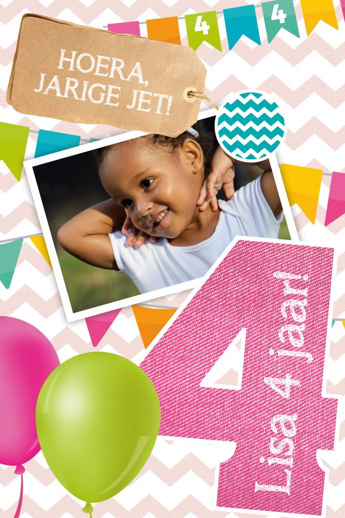 Vlaggetjes in verschillende kleuren en ballonnen, wat vrolijk! Dit kleurrijke kaartje heeft een modern achtergrondpatroon, een stoffen 4 en een hip kraftlabel. Voeg een leuke foto toe en maak dit kaartje helemaal naar wens!