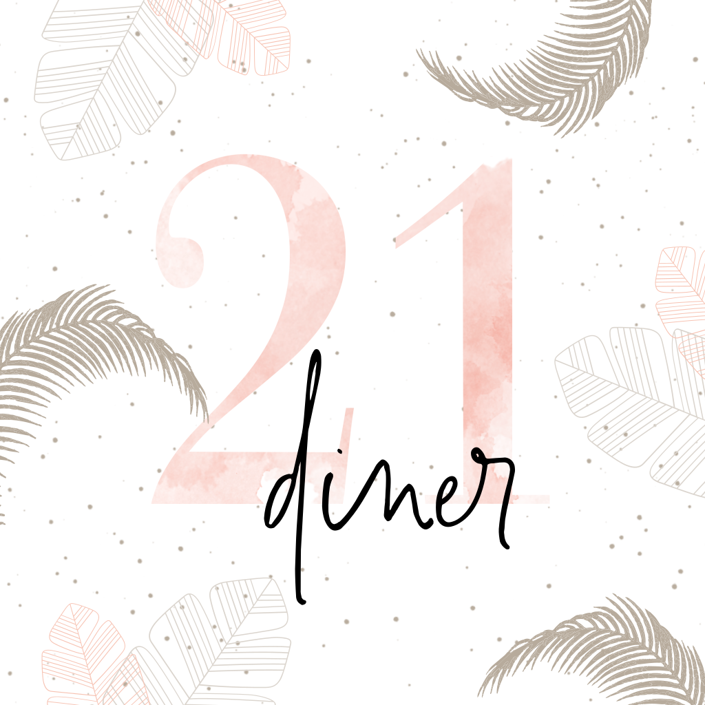 Mooie, botanische uitnodiging voor een diner. Op de voorkant staan bladen en grijze stippen. De lettertypes kunnen eenvoudig in de online editor worden aangepast.
