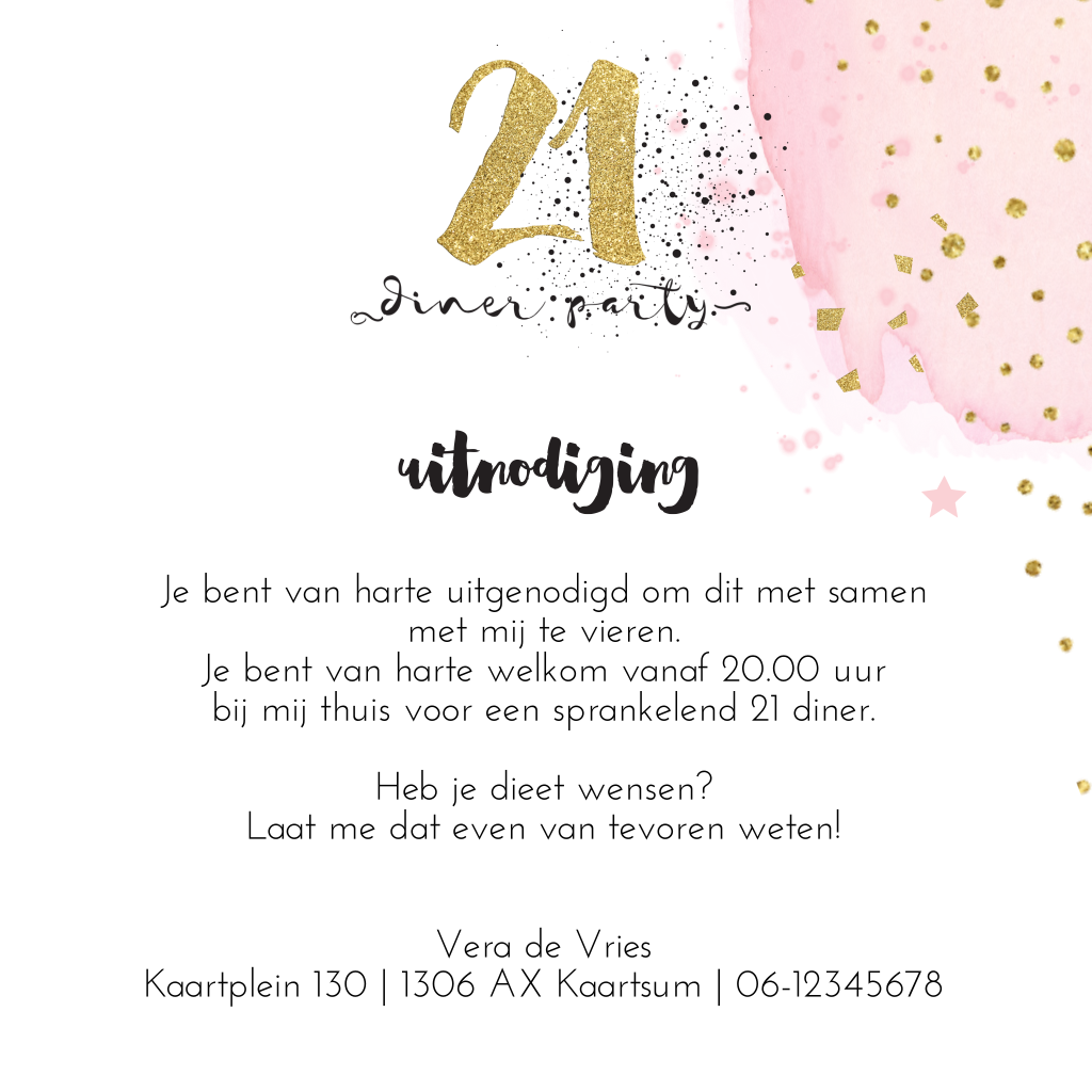 Houdt jij een 21 dinner? Dit is de perfecte uitnodiging! De vrolijke confetti en de gouden cijfers zien er lief en chic uit.
